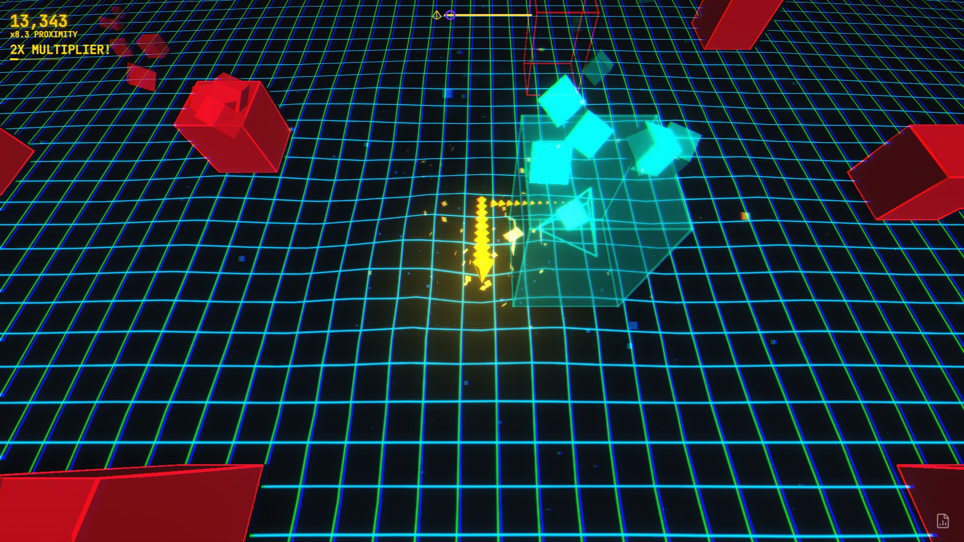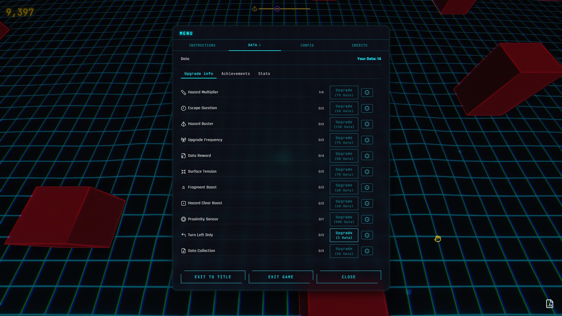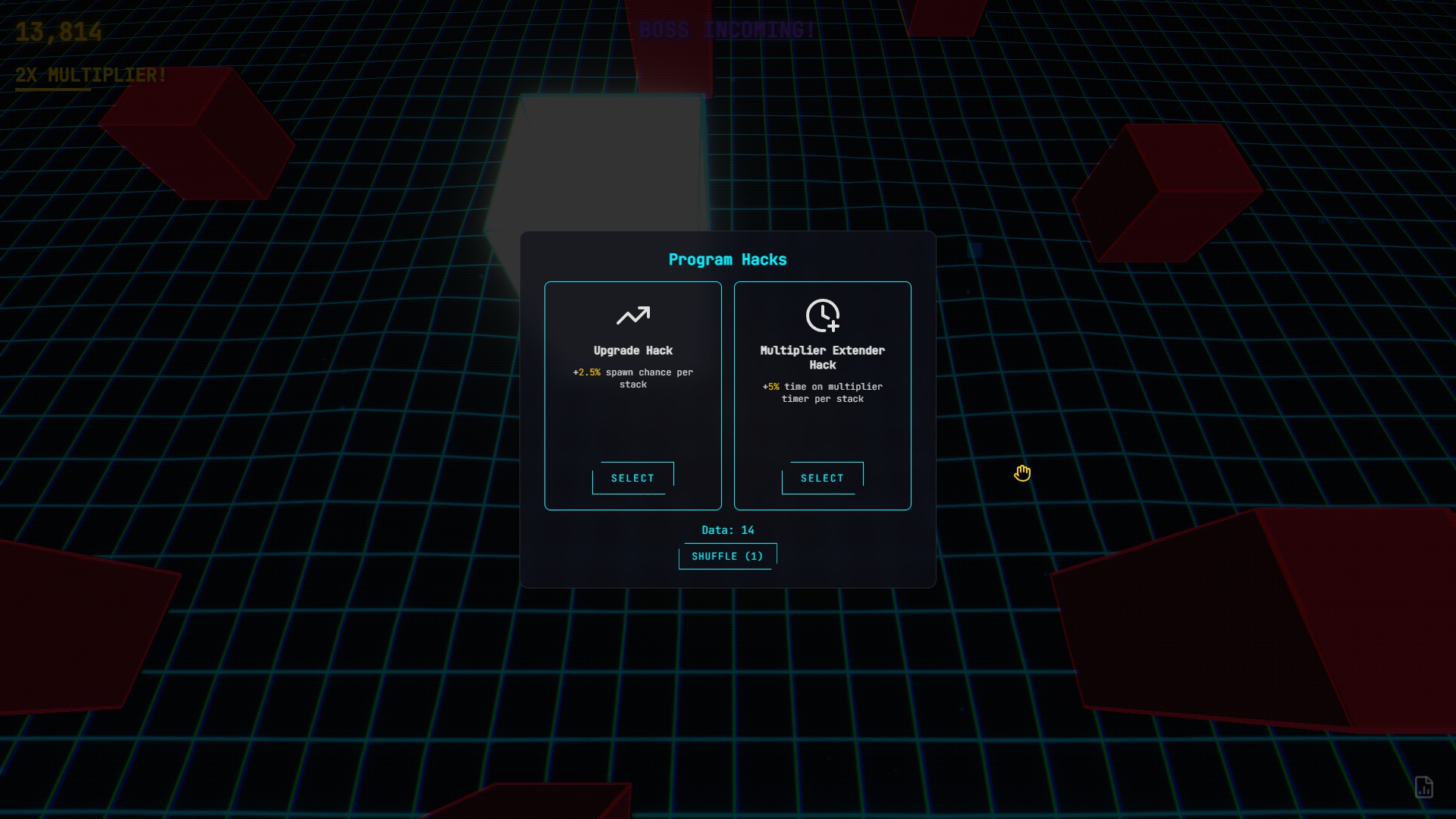 Scoring fragments at the end are turned into data that can be spent on upgrades to further high scores. Collect program hacks to boost upgrades during a run to maximize your scoring potential further.